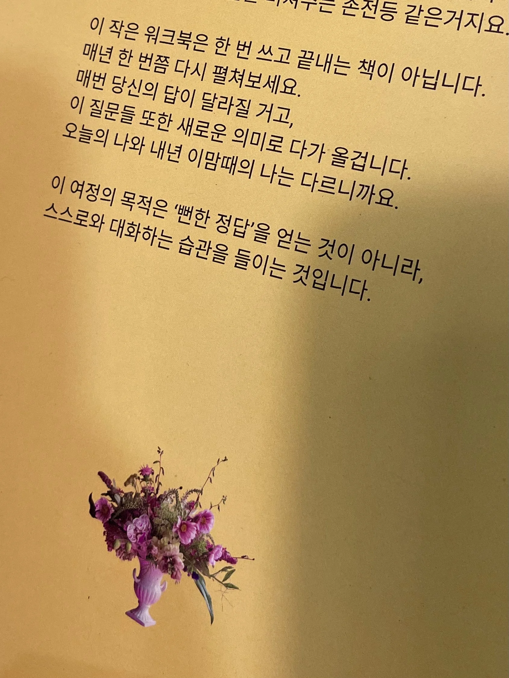제가 가장 좋았던 건 실용적이면서도 깊이 성찰할 수 있다는 어찌보면 상반된 점이에요. 거창한 동기부여 문구들을 던지는 대신, 정말 중요한 것들 - 내 가치관, 습관, 환경, 그리고 삶의 목적 - 을 발견하도록 명확한 질문들로 나를 안내해 주더라고요.